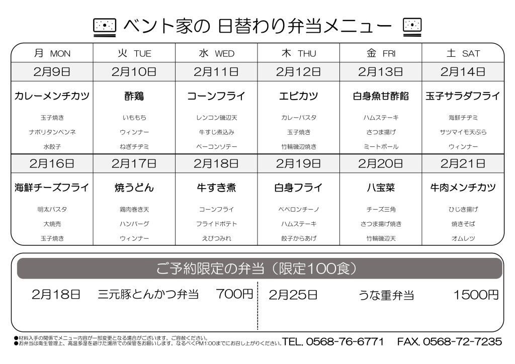 小牧・春日井・犬山・扶桑に配達!2026年2月9日からの日替わり弁当 – 配達・宅配 2026.02.04 愛知県小牧市、春日井市の一部、岩倉市の一部、北名古屋市の一部、豊山町の一部、犬山市の一部、扶桑町の一部、名古屋市北区の一部、大口町の一部の企業、オフィス、工場、団体、学校の皆様へ美味しいお弁当を心を込めてお届けいたします。 Tweet Share RSS Pin it